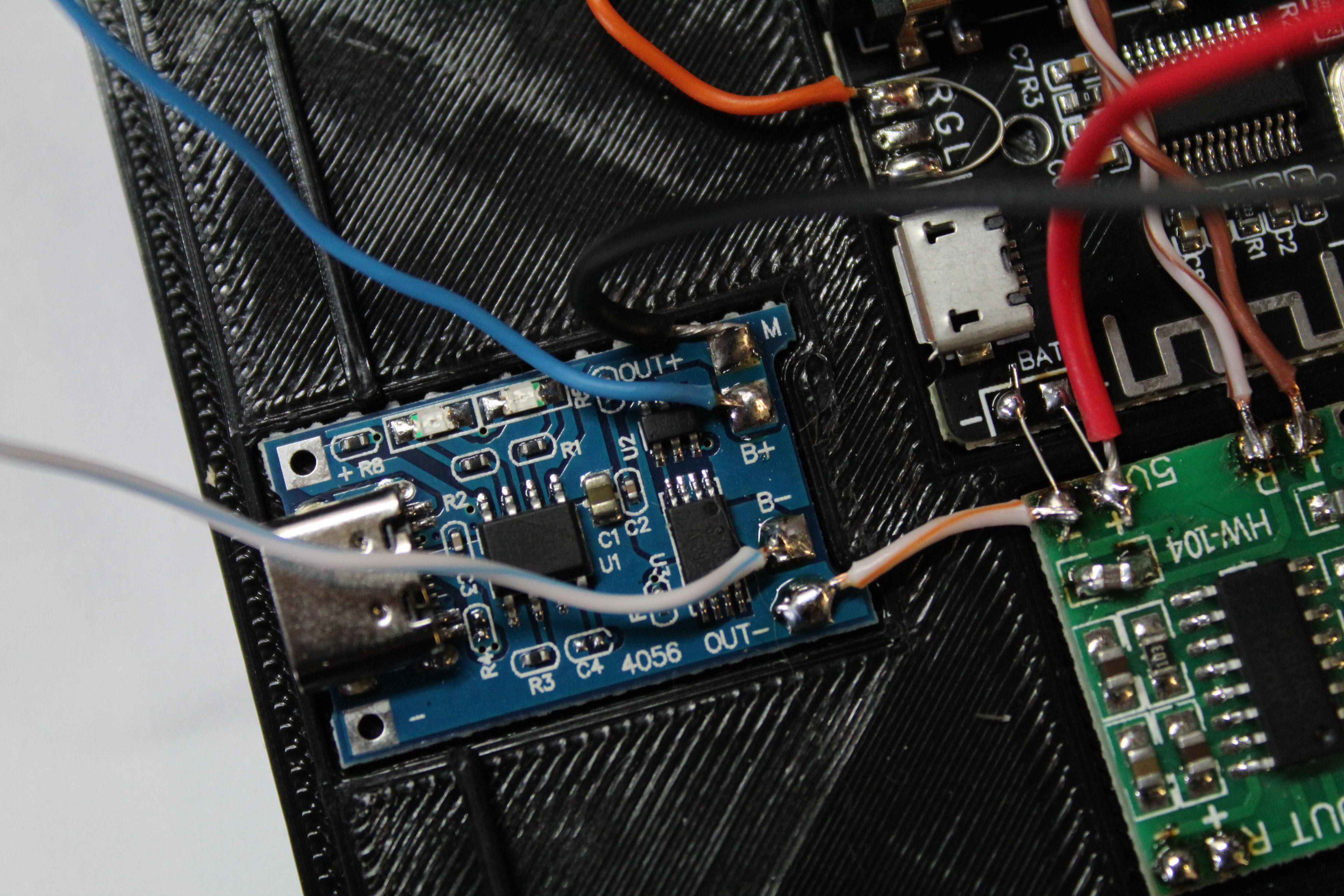 Attach a wire to the charging circuit ground connection (Marked: out-) and to the ground rail of the Bluetooth module and AMP.